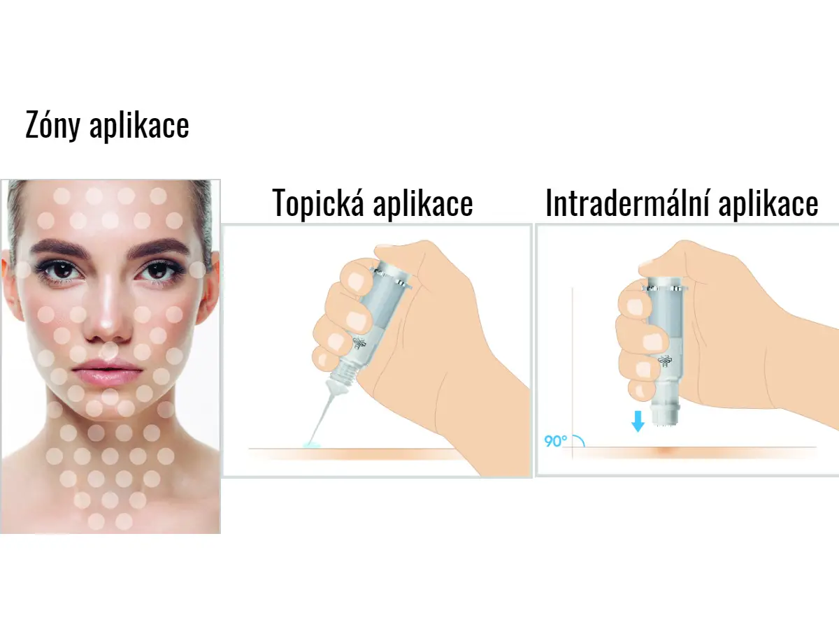 Ošetření pleti se provádí zcela bezbolestně pomocí předdávkované injekční stříkačky, z které se po každém stlačení uvolní přesné množství séra do pokožky. Výsledný efekt je okamžitý a dlouhotrvající. Můžete si vybrat buď nástavec s mikrojehličkami anebo aplikátor pro topické užití. Nástavec s mikrojehličkami je určen pro intradermální aplikaci, což je aplikace přímo do kůže. Intradermální aplikace se využívá po celém obličeji, krku a dekoltu. Zatímco topické užití je vhodné přímo na konkrétní místo, kde jsou nejhlubší vrásky, nejčastěji se využívá na nosoretní rýhy. V séru jsou obsaženy dva typy kyseliny hyaluronové, díky čemuž bude vaše pleť krásně zregenerovaná a hydratovaná. Sérum je vhodné pro ženy i muže po dosažení věku 30 let. Používejte 1-2x měsíčně.