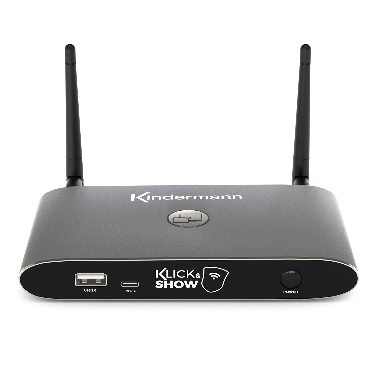 Kindermann KLICK&SHOW K-40 umožňuje bezdrátově prezentovat obraz z vašeho notebooku nebo mobilních zařízení na velkém displeji nebo projekci. V případě dotykového LCD nebo interaktivní tabule i včetně dotyku. Snadno a bez nutnosti složitého tahání kabelů přeměníte jednací místnost nebo učebnu v moderní prezentační prostor.