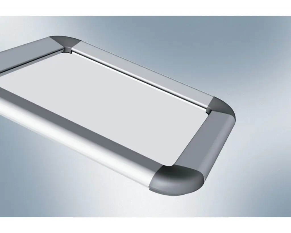 Informační panel na stěnu (plakátový rám) elegantního designu, stříbrný se šedými rohovými spojkami. Velmi lehká konstrukce. Otevírání - klipový systém po celém obvodu tabule (všechny 4 strany). Stačí lišty odklopit a snadno zasunout informační materiál. Flexibilní pružinový systém zajišťuje dlouhou životnost výrobku. Tabule NENÍ magnetická. Přední antireflexní PVC čirá fólie je chráněna proti UV záření. Dodáváno včetně montážního materiálu na zeď. Síla rámu 25 nebo 35 mm.