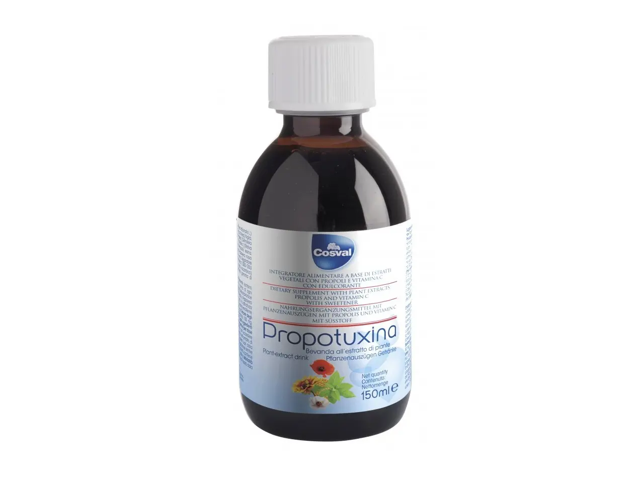 Složení: sorbitol; osmotizovaná voda; s.extrakty z: proskurníku [(Althea officinalis L.) kořen, kukuřičný maltodextrin] – 1%; nesměny [(Adhatoda vasica Nees) listy, kukuřičný maltodextrin] 1% - titr.na 1-2% vasicin; zaplevanky [(Grindelia robusta Nutt.) květy, kukuřičný maltodextrin] 0,8%; slézu [(Malva sylvestris L.) listy, kukuřičný maltodextrin] 0,5%; propolis (propolisová pryskyřice, kukuřičný maltodextrin) 0,25% - tritr.na 6% galangin; mák vlčí pravý [(Papaver rhoeas L.) květ, kukuřičný maltodextrin] 0,25%; aroma; regulátor kyselosti: laktát sodný; Acidifikátory: kyselina citronová; Bromelin 2500 GDU z ananasu [Ananas comosus (L.) Merr. kmen] 0,15%; vitamín C (kyselina L-askorbová) 0,15%; konzervační látka: sorbát draselný; zahušťovadlo: xanthanová guma; sladidlo: stéviové glykosidy.