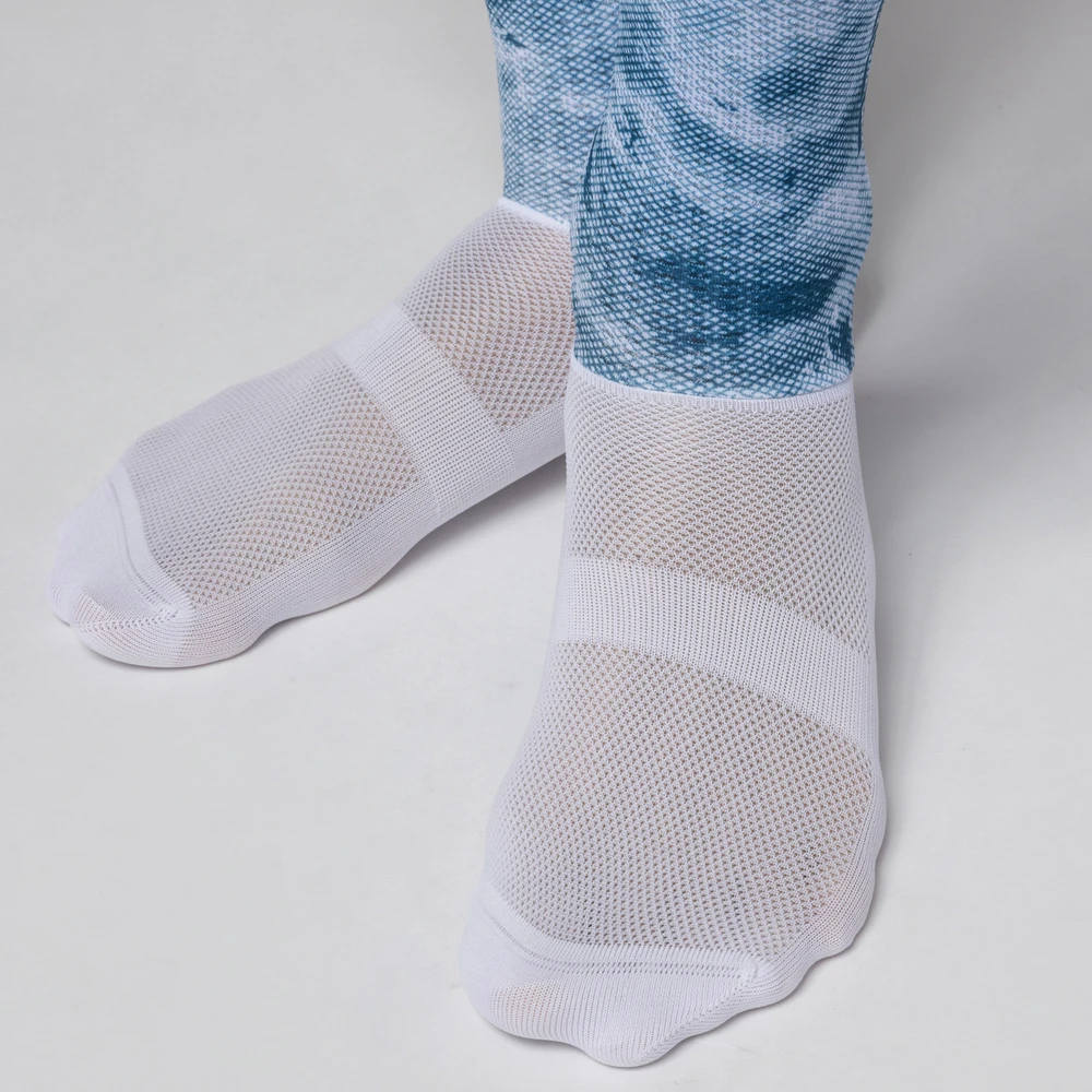 Unisex letní ponožky ALÉ TYPHOON v barvě lagoon jsou navržené pro co nejnižší odpor vzduchu a maximální stabilitu při jízdě. Horní 18 cm vysoká část z materiálu Aero Cell s hexagonální strukturou pomáhá zlepšit aerodynamiku, zatímco prodyšná spodní část podporuje odvod vlhkosti.
