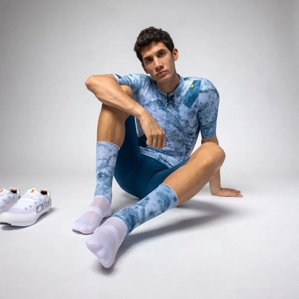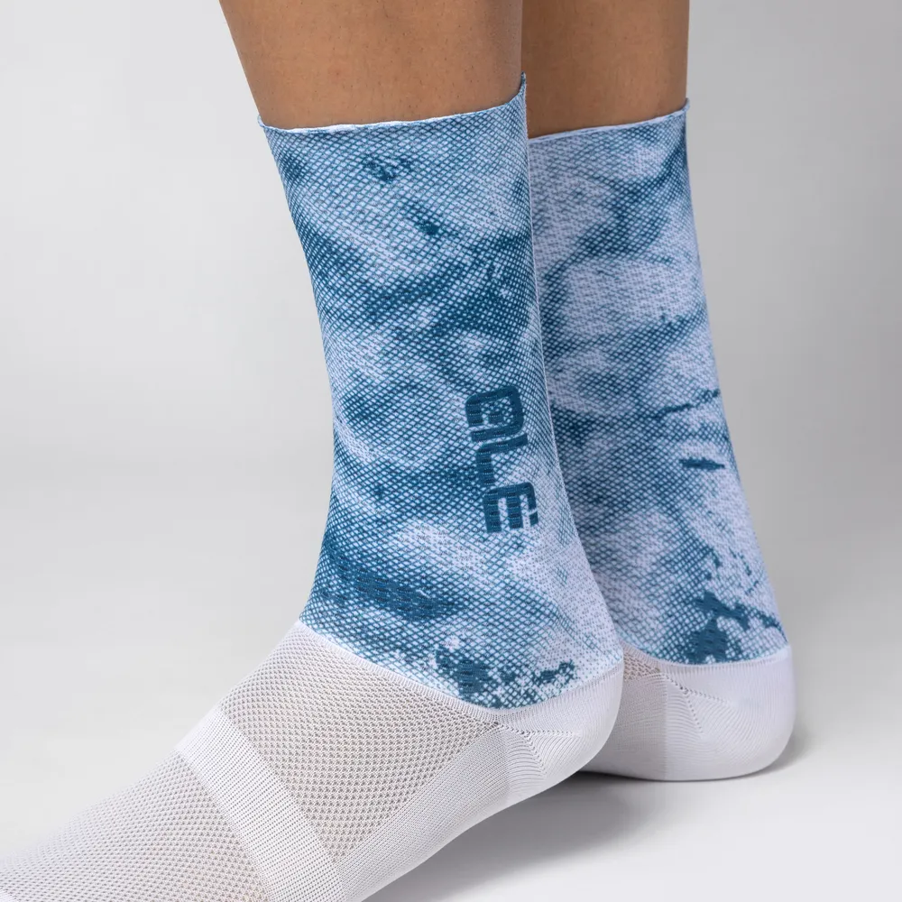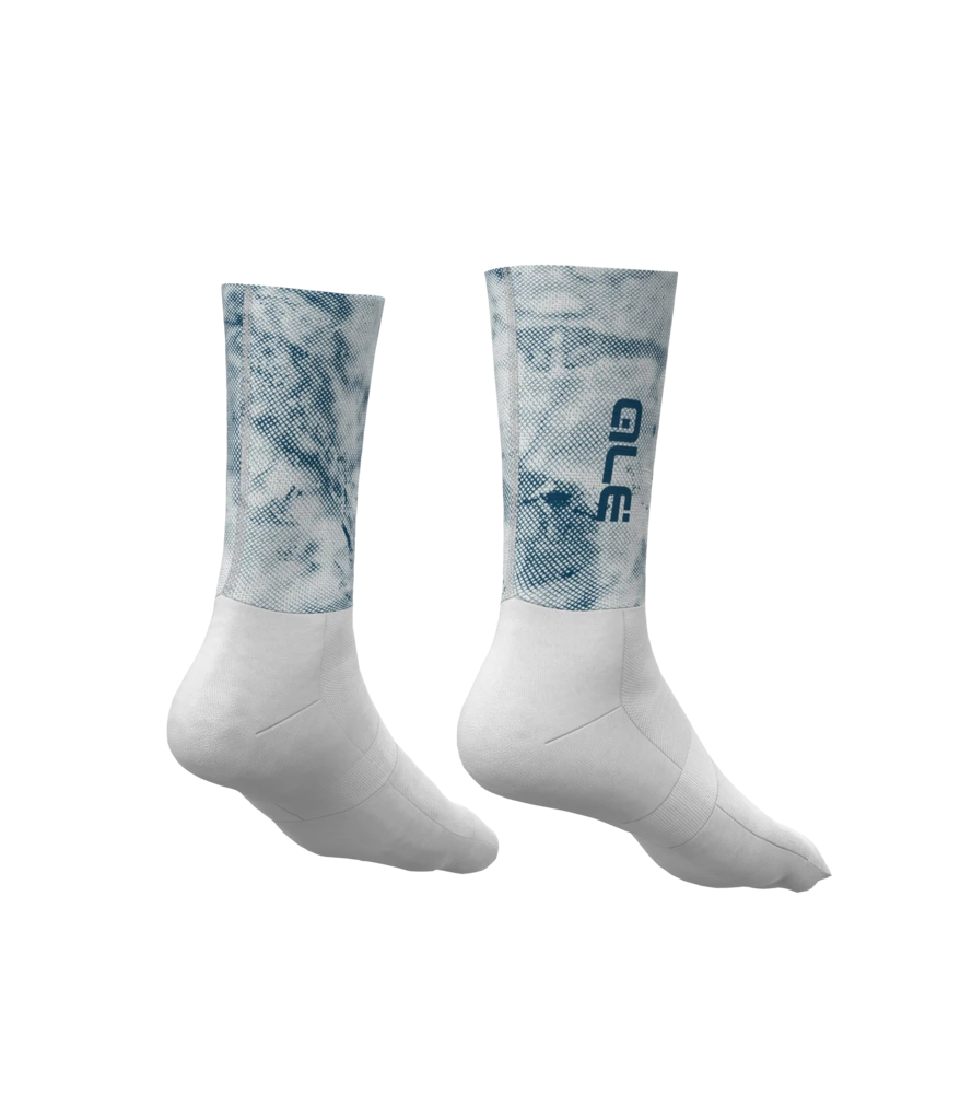 Unisex letní ponožky ALÉ TYPHOON v barvě lagoon jsou navržené pro co nejnižší odpor vzduchu a maximální stabilitu při jízdě. Horní 18 cm vysoká část z materiálu Aero Cell s hexagonální strukturou pomáhá zlepšit aerodynamiku, zatímco prodyšná spodní část podporuje odvod vlhkosti.