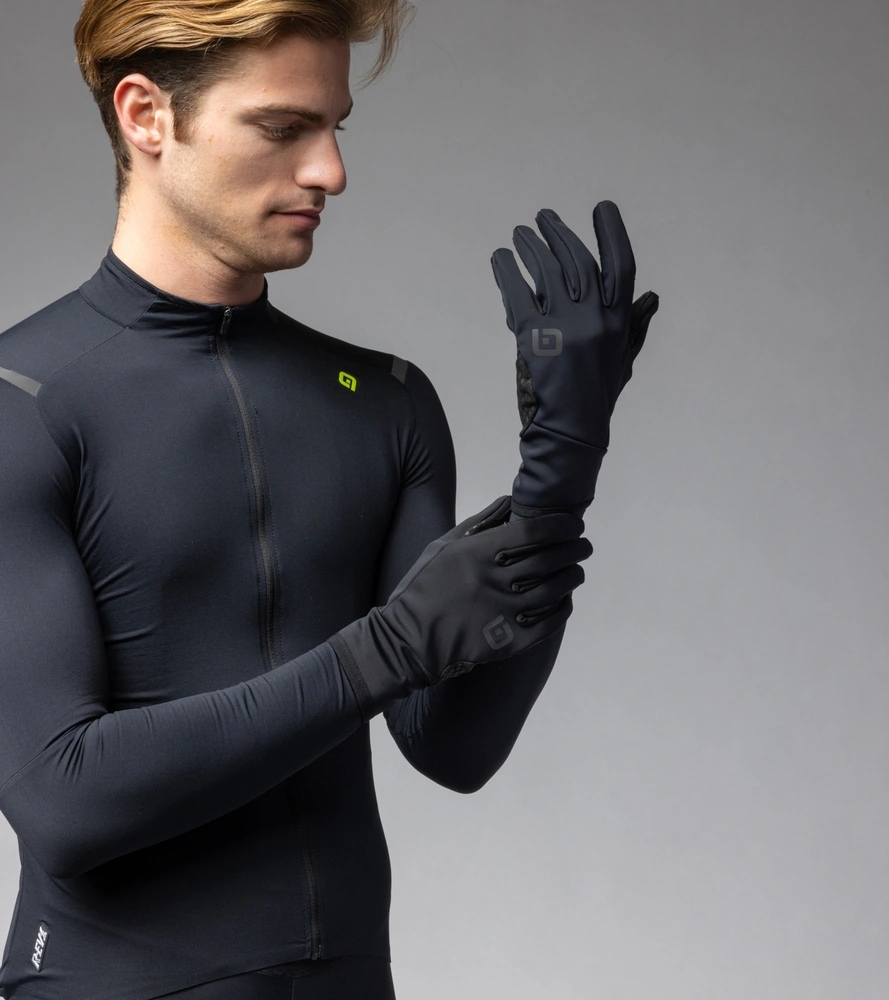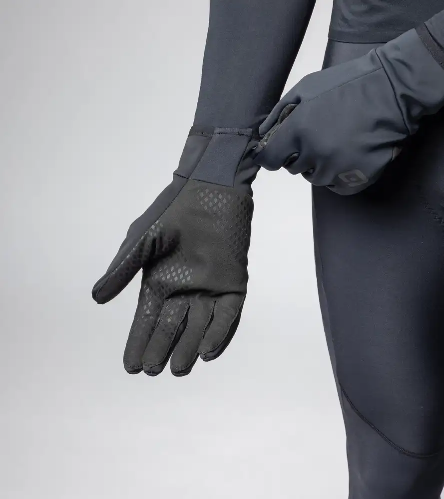 Zimní unisex cyklistické rukavice ALÉ v černé barvě (modelový rok 2027) jsou vyrobené z větruodolného softshellu a mají ergonomicky předtvarovaný střih. Silikonový protiskluz na dlani a prstech zlepšuje jistotu úchopu a reflexní logo pomáhá s viditelností za šera.