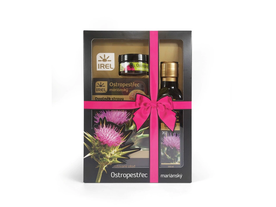 Dárková sada obsahuje produkty z ostropestřce mariánského - ostropestřecový olej, mechanicky upravený plod sypký, ostropestřecová pasta.
