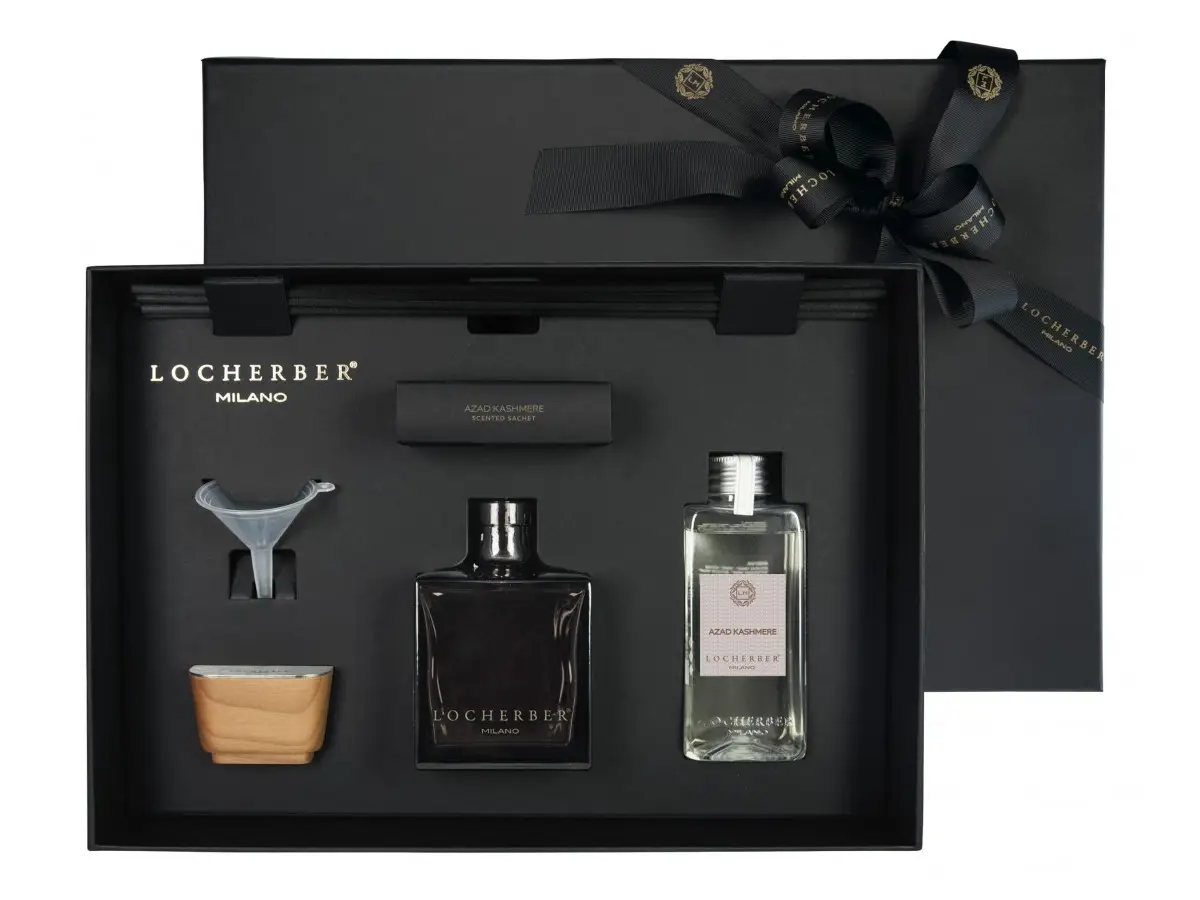 Luxusní dárková sada v černé krabici se zlatým minimalistickým nápisem Locherber Milano. Sada obsahuje prázdný ručně barvený flakon, víčko z luxusního ořechového dřeva s kovovou destičkou, náplň do difuzéru 250 ml, trychtýřek, tyčinky do difuzéru a vonný sáček. Náplň je s vůní AZAD KASHMERE, což je teplá, sladce kořeněná a pudrová vůně.
