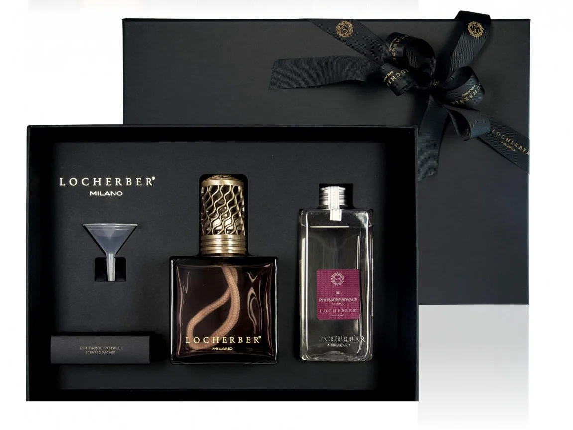 Luxusní dárková sada v černé krabici se zlatým minimalistickým nápisem Locherber Milano. Sada obsahuje katalytickou lampou, náplní o objemu 500ml, vonný sáček a trychtýřek pro snadné nalití náplně do lampy. Náplň i vonný sáček je s vůní BANKSIA, což je aromatická, dřevitá a kořeněná vůně.