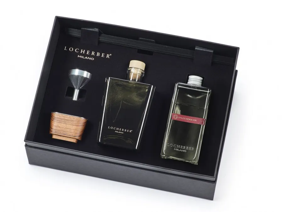 Luxusní dárková sada v černé krabici se zlatým minimalistickým nápisem Locherber Milano. Sada obsahuje prázdný ručně barvený flakon, víčko z luxusního ořechového dřeva s kovovou destičkou, náplň do difuzéru 500 ml, trychtýřek a tyčinky do difuzéru. Náplň je s vůní DOLCE ROMA XXI, což je svěží, ovocná, citrusová, mechová a ambrová vůně inspirovaná věčným městem, Římem.