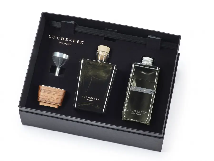 Luxusní dárková sada v černé krabici se zlatým minimalistickým nápisem Locherber Milano. Sada obsahuje prázdný ručně barvený flakon, víčko z luxusního ořechového dřeva s kovovou destičkou, náplň do difuzéru 500 ml, trychtýřek a tyčinky do difuzéru. Náplň je s vůní GRIGIO MILANO, což je květinová, mechová vůně inspirovaná městem módy designu a stylu, Milánem.