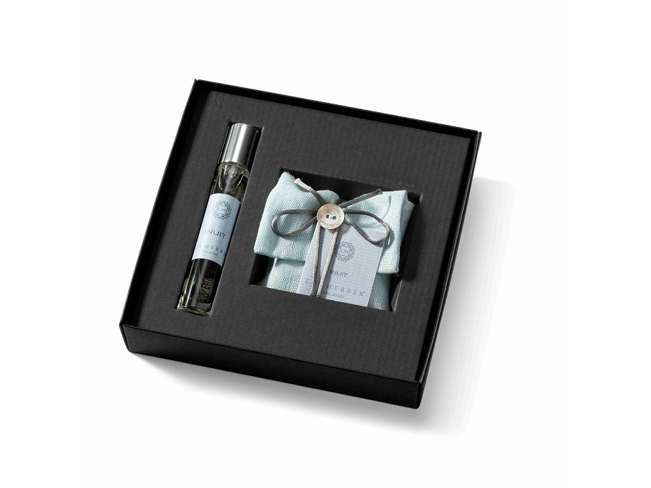 Luxusní dárková sada v černé krabici se zlatým minimalistickým nápisem Locherber Milano. Sada obsahuje parfém s rozprašovačem o objemu 10 ml a vonný sáček. Parfém i vonný sáček je s vůní INUIT, což je svěží, zeleně citrusová vůně.
