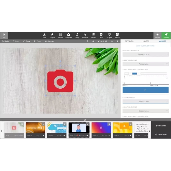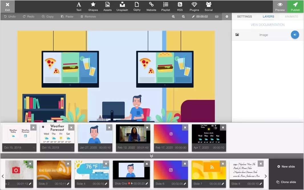 Prostředí pro správu zobrazování informací obsahuje také skvělý a přehledný editor obsahu. Máte tak veškerou kreativitu ve svých rukách. Obsahuje velké množství předem připravených šablon z různých tematických oblastí k okamžitému použití a tak první kroky budou o to jednodušší. Můžete vkládat různé obrázky, videa, texty, webové stránky, online obsah, apod. K dispozici je řada widgetů na počasí, RSS zprávy apod.