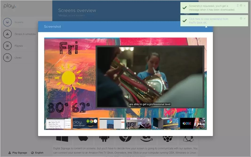 Pro vytvoření a distribuci obsahu potřebujete také zobrazovací zařízení tedy displej (lze použít i projektor). Ten musí být doplněný o počítač, na kterém lze spustit aplikaci, která připravený obsah v námi určenou dobu zobrazí. Využít můžete ty s Windows, Mac OS, Linux, Android nebo Chrome, ale oblíbené je také velmi rozšířené Raspberry. Dále tento SW podporují i přímo samotné displeje od různých světových značek, například Legamaster, Samsung, LG, SONY apod. Počet podporovaných zařízení se stále zvyšuje a tak ani pro Vás nebude problém najít vhodné řešení. Klasické televize, které jsou určené do domácnosti na tento provoz nejsou určené a samotní výrobci je nedoporučují. Jsou levnější než průmyslové displeje, ale takový náročný provoz jako je 16 hodin denně nezvládnou.