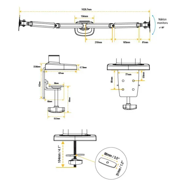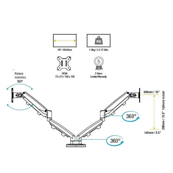 - Nosnost až 8 kg na rameno: Vhodný pro většinu monitorů.