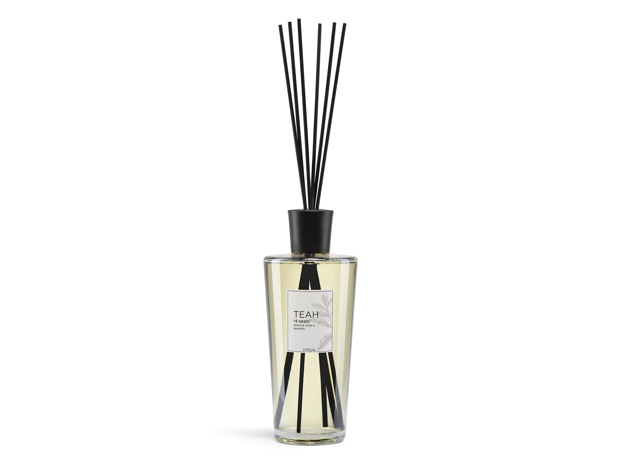 ERBAL Aroma difuzér TEAH vytváří zelenou a kořenitou atmosféru díky kombinaci černého rybízu, bergamotu, černého pepře, koriandru, tymiánu, černého čaje a hřejivého cedrového dřeva s pačuli. Elegantní skleněná lahvička s černými tyčinkami působí moderně a čistě. Vůně je výrazná, harmonická a ideální pro menší i středně velké prostory.