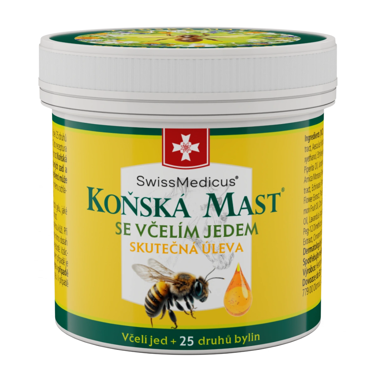 Koňská Mast se včelím jedem je unikátní produkt, který spojuje osvědčený účinek 25 druhů bylin s účinkem včelího jedu. Včelí jed slouží jako přírodní látka ke snížení citlivosti. Tato receptura zároveň obsahuje zvýšený podíl bylin, o kterých je známo, že zlepšují pružnost a hybnost. Koňská Mast se včelím jedem je vhodná k masáži pokožky v oblasti namožených zad a kloubů. Díky použití speciální směsi ingrediencí může tento balzám chladit i hřát zároveň. Tento efekt může na počátku aplikace způsobit mírné ochlazení, následně však dochází k prohřátí a žádoucímu prokrvení pokožky.