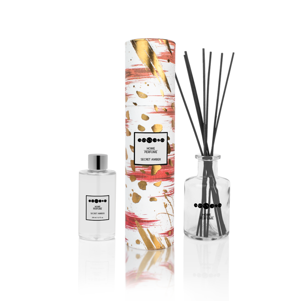 ESSENS Home Perfume - SECRET AMBER je tajemná a zklidňující vůně plná zelených tónů borovic se s jemným nádechem jasmínu i vanilky snoubí v harmonicky vyváženou vůni přírody, lesů, jantaru i pižma. Elegantní aroma difuzér s jedinečnou a dlouhotrvající vůní ideální pro každý interiér. Místnost krásně provoní a zároveň jí dodá moderní styl.