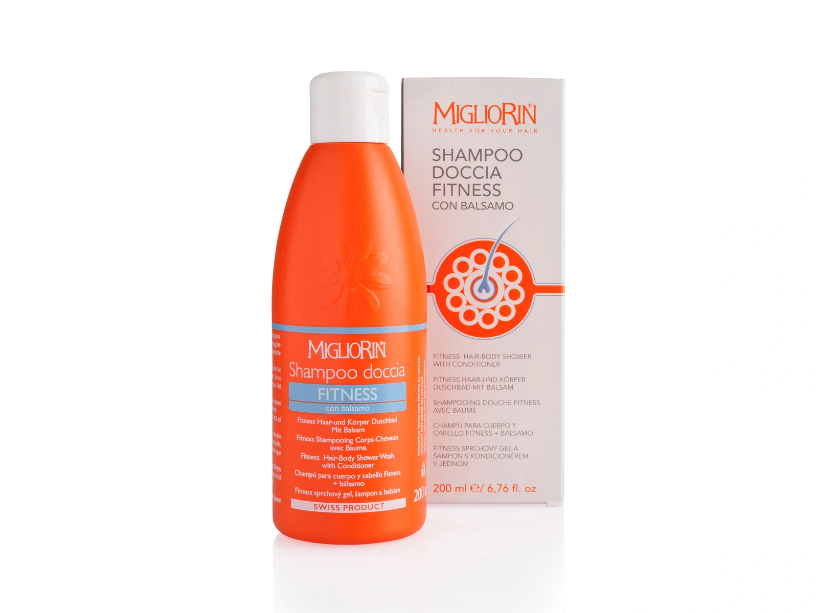 Sprchový gel, šampon a balzám zaručují praktický a příjemně osvěžující výsledek pro všechny typy pleti i vlasů. Je vhodný i na mytí citlivých intimních partií. Šampon Migliorin fitness nevysušuje pokožku a příjemně voní.