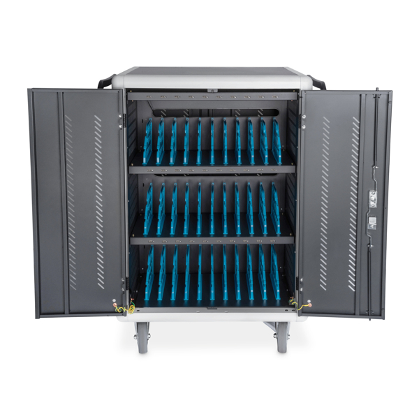 Mobilní nabíjecí skříň až pro třicet tabletů nebo notebooků s velikostí displeje do 15,6". Zařízení je možné nabíjet buď originálním napájecí adaltérem ze zásuvky na 230V nebo přímo z USB-C konektoru. Skříň má robustní kovovou konstrukci, čtyři masivní kolečka a uzamykatelné dvířka z obou stran.