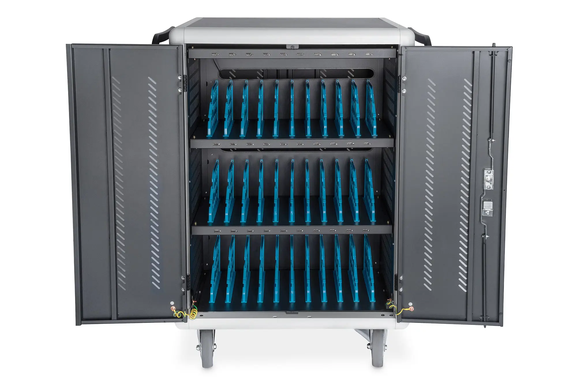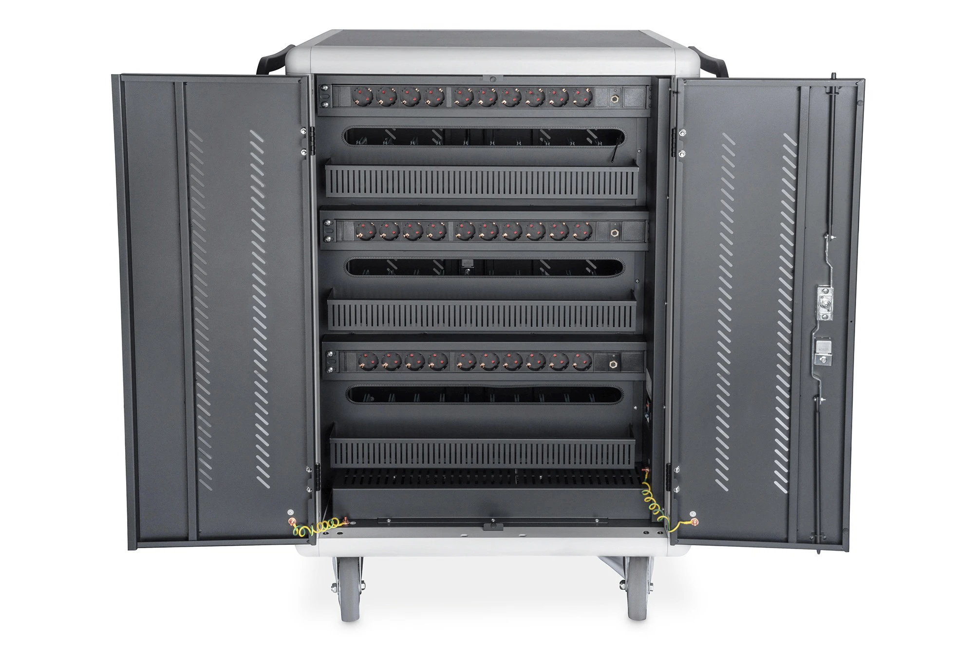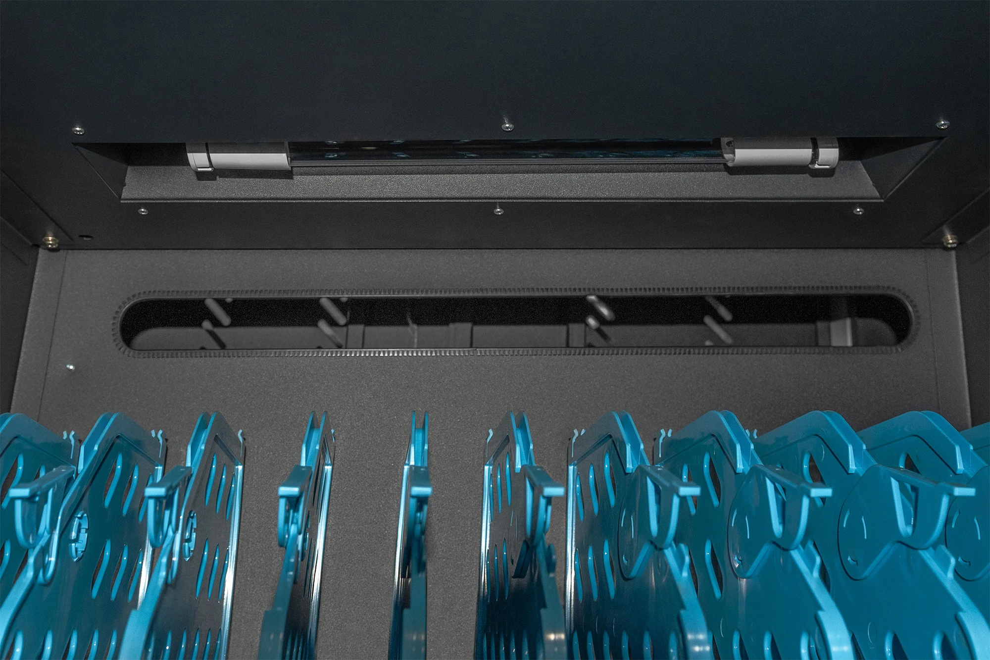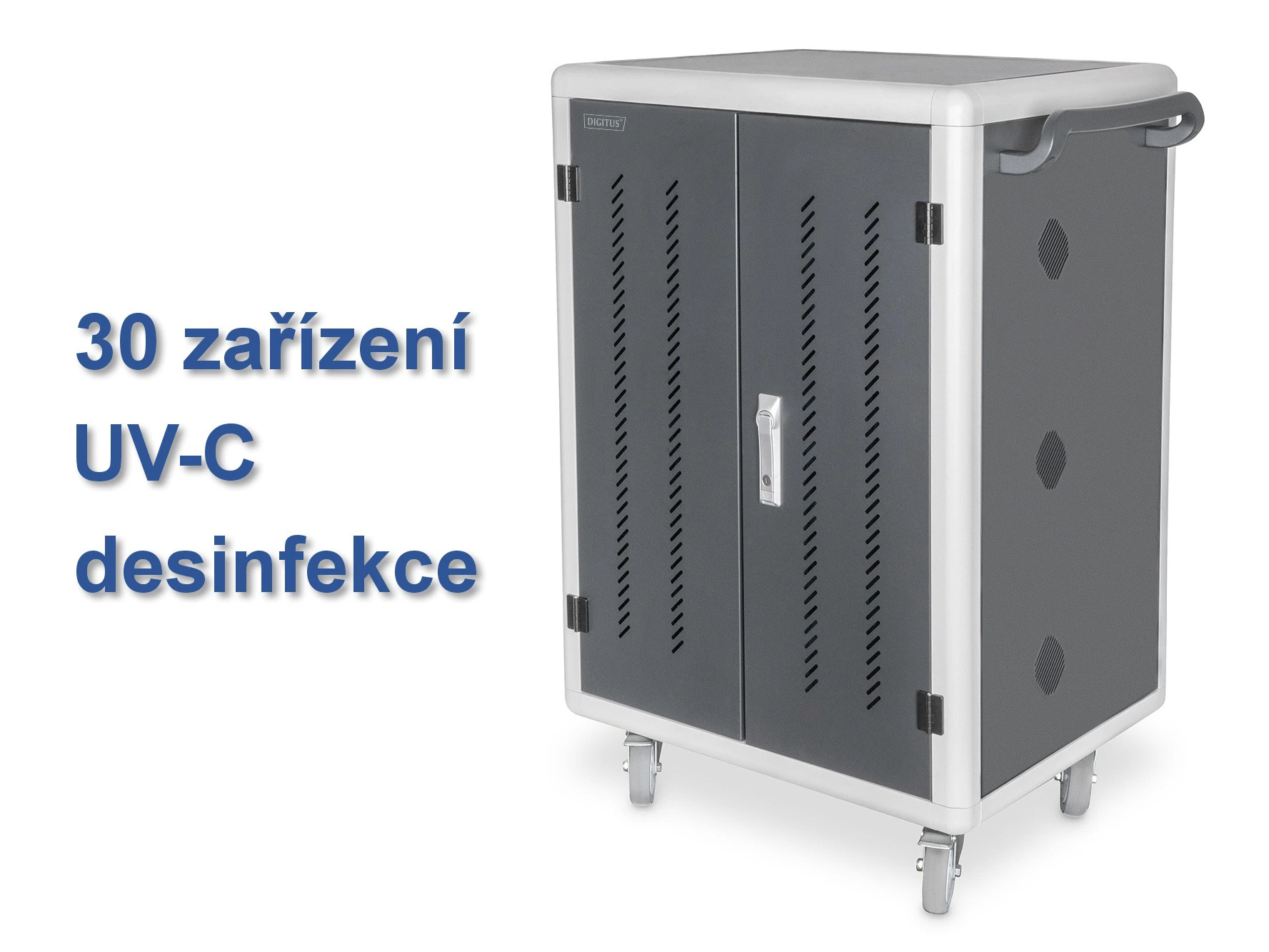 Mobilní nabíjecí skříň až pro třicet tabletů nebo notebooků s velikostí displeje do 15,6". Zařízení je možné nabíjet buď originálním napájecí adaltérem ze zásuvky na 230V nebo přímo z USB konektoru.Skříň je vybavena UV-C zářivkami pro desinfekci nabíjených zařízení, má robustní kovovou konstrukci, čtyři masivní kolečka a uzamykatelné dvířka z obou stran.