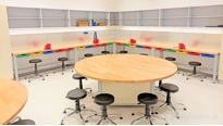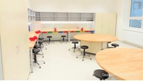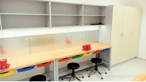 V učebně je vše co budou potřebovat. Po obvodu jsou pracovní ponky s deskou z kvalitní bukové spárovky se svěráky na hrubší práce. V dolní části s výsuvnými boxy na nářadí a policí na uložení materiálů. Na zdi jsou děrované desky se systémem chytrého uložení nářadí a pomůcek pro mladé tvůrce. Nad nimi je dostatek místa na uložení materiálů a dalších nástrojů nebo nářadí v otevřených skříňkách.