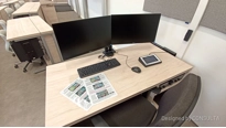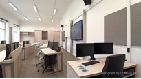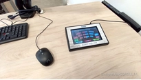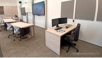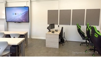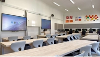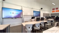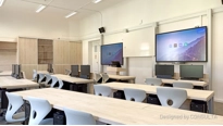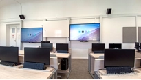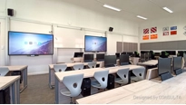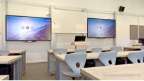 Ve středu nové učebny, která je oproti původní otočená o 90° je umístěná keramická bílá bezrámová tabule na pylonovém zvedacím systému a po obou stranách jsou opět na pylonech dva 86“ dotykové LCD displeje. Tato chytrá kombinace, ve spojení se stoly s elektricky ovládaným výsuvem počítačů, nabízí učitelům široké možnosti pro organizaci výuky. V katedře je umístěný počítač se dvěma LCD monitory a další počítač je přímo v pultu před tabulí. Ten má dotykový LCD displej s úhlopříčkou 22" a slouží během výuky učiteli pro snadné řízení výuky, zobrazení prezentací apod. Pro snadnou obsluhu je i tento pult s vestavěným elektrickým ovládáním výšky. Na velkých dotykových displejích lze volit různé možnosti zobrazení, které se ovládá chytrý ovládací systém se 7" dotykovým displejem. Současně se tímto systémem ovládají také elektrické výsuvy studentských stolů. Lze vysunout všechny, levou nebo pravou polovinu a také jednotlivé bloky stolů.