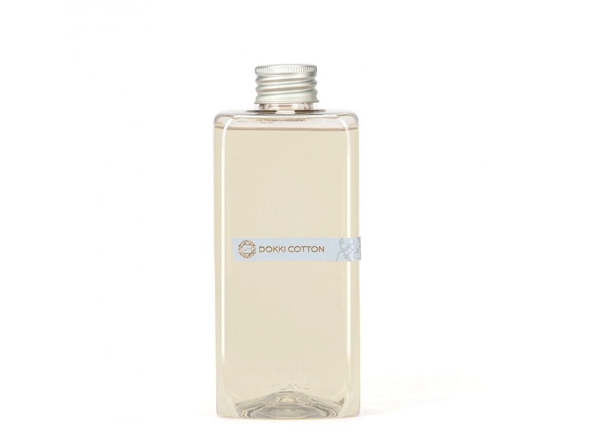 Náhradní náplň Locherber Milano pro difuzéry s vůní DOKKI COTTON, což je jemná, pudrově květinová vůně s mechovými tóny. Velikost: 500 ml