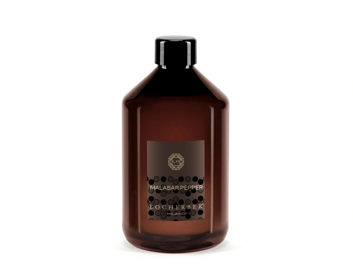 Náhradní náplň Locherber Milano pro difuzéry s vůní MALABAR PEPPER, což je orientální, aromatická, kořeněná a dřevitá vůně. Velikost: 500 ml