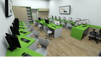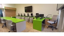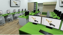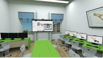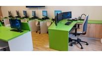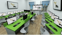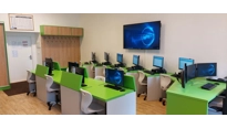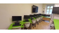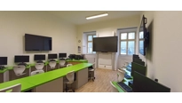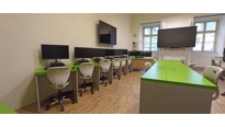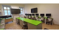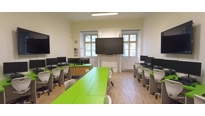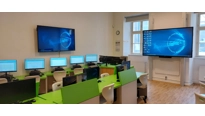 V prostorách historické budovy střední školy v Praze vznikla nová moderní počítačová učebna. V čele místnosti je mezi okny umístěný 86" dotykový LCD displej na pylonech, kterému sekundují dva 65" LCD displeje po stranách na zdi. Toto chytré umístění displejů tak umožní všem studentům pohodlné sledování učiva, které lze navíc rozdělit na dvě nezávislé skupiny. Obraz na displejích je možné libovolně přepínat. Stoly po obvodu učebny jsou s pevně instalovanými LCD displeji, zatím co střední řada má elektricky vysouvatelné displeje, které se vysunou jen pokud je potřeba.