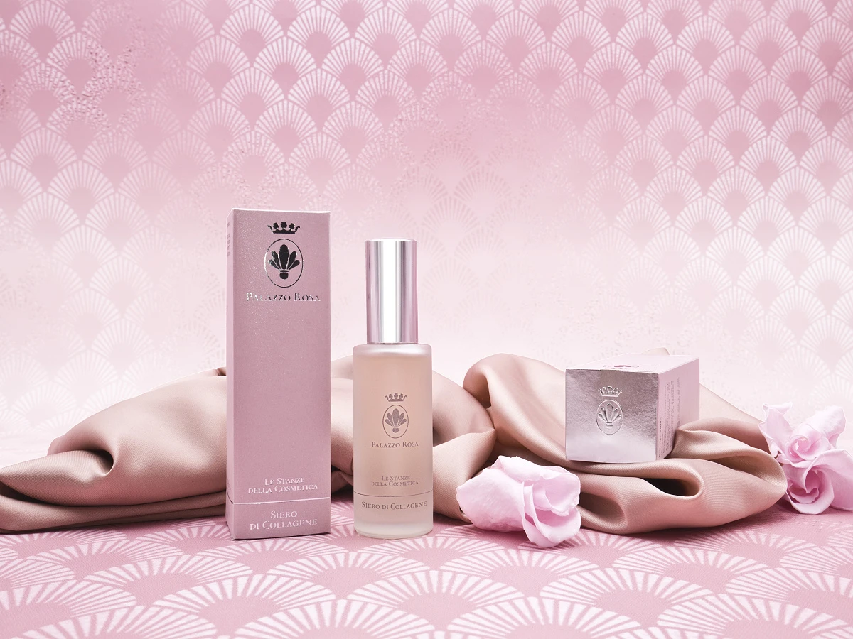 - Kolagen: nejdůležitější protein pojivové tkáně. Široce se používá pro své účinky proti stárnutí. Podporuje regeneraci a obnovu pokožky a umožňuje vám vyplňovat malé vrásky a zjemňovat výrazové linie. Kromě toho dodává naší pokožce větší pružnost a měkkost. Snižuje zánětlivé procesy pokožky, jako je akné, ekzémy nebo lupénka. Zabraňuje vzniku celulitidy a strií, pomáhá zlepšit proces hojení. Naše sérum obsahuje směs aminokyselin a bílkovin užitečných pro upevnění buněčných struktur, které působí na fyziologické mechanismy stimulující produkci kolagenu, aby se zvedly tkáně, obnovil tón a ovalizovala tvář. Laboratoř Palazzo Rosa využívá pokročilou biotechnologii, která zvyšuje proniknutelnost našeho kolagenu a zvyšuje jeho absorpci pokožkou. Struktura séra je zmenšena na mikroskopické části, které dovedou aktivní látku do srdce buněk. Naše sérum zajišťuje regeneraci rezerv kolagenu ve všech vrstvách pokožky s viditelnými účinky již po 24 hodinách (tkáně vypadají pevnější, svěžejší, vyplněné, a proto uvolněné, včetně účinku na vrásky). Výsledky jsou ale také dlouhodobé: jemné linie a výrazové linie jsou zmenšeny, pokožka je vyhlazena, kontura očí je jasnější. Účinek aplikace je prakticky okamžitý: po několika minutách dojde ke snížení výrazových linií, vrásek, otoků a tmavých kruhů: opravdové regenerační ošetření pleti. Vzhledem ke zklidňujícímu a relaxačnímu účinku doporučujeme každodenní aplikace kolagenu, pokud používáte make-up: pokožka namáhaná make-upem může potřebovat posilovací účinek k regeneraci, zachování její pružnosti a pevnosti a přirozeného jasu. U tohoto typu péče je zaručen svěží vzhled.