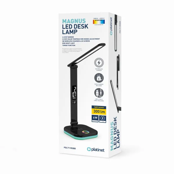 Stolní LED lampa zaujme moderním a elegantním designem, který skvěle zapadne do každého interiéru – od pracovního stolu až po noční stolek. Kromě atraktivního vzhledu nabízí i řadu praktických funkcí pro pohodlné každodenní používání. Díky 3 úrovním jasu (20 %, 50 %, 100 %) si snadno nastavíte intenzitu světla přesně podle toho, zda pracujete, čtete nebo se chystáte ke spánku. Lampa navíc nabízí 5 režimů barevné teploty v rozsahu 3000–6500 K, takže můžete přepínat mezi teplým, neutrálním i studeným bílým světlem podle aktuální nálady nebo denní doby. O světelný výkon se starají úsporné LED diody s výkonem 6 W a světelným tokem 300 lumenů, které poskytují dostatek světla pro běžné domácí i kancelářské využití. Stylovým doplňkem lampy je také RGB podsvícení, které můžete využít zejména v nočním režimu pro vytvoření příjemné atmosféry bez ostrého osvětlení. Lampa je vybavena multifunkčním displejem, který zobrazuje čas, datum i teplotu v místnosti. Nechybí ani vestavěný budík. Velkou výhodou je také integrovaná 5W bezdrátová nabíječka, díky které budete mít svůj chytrý telefon neustále nabitý a na dosah ruky – bez zbytečných kabelů. Praktická je i funkce automatického vypnutí pomocí 45minutového časovače. Napájení lampy je řešeno pomocí kabelu o délce 150 cm, napětí je 5V/3A, 6 W. Lampa je vybavena vestavěnou LED technologií – není potřeba dokupovat žárovku. Barevné podsvícení základny. Možnost nastavení intenzity světla (stmívání). Lampa obsahuje integrovanou bezdrátovou nabíječku kompatibilní s Qi zařízeními.