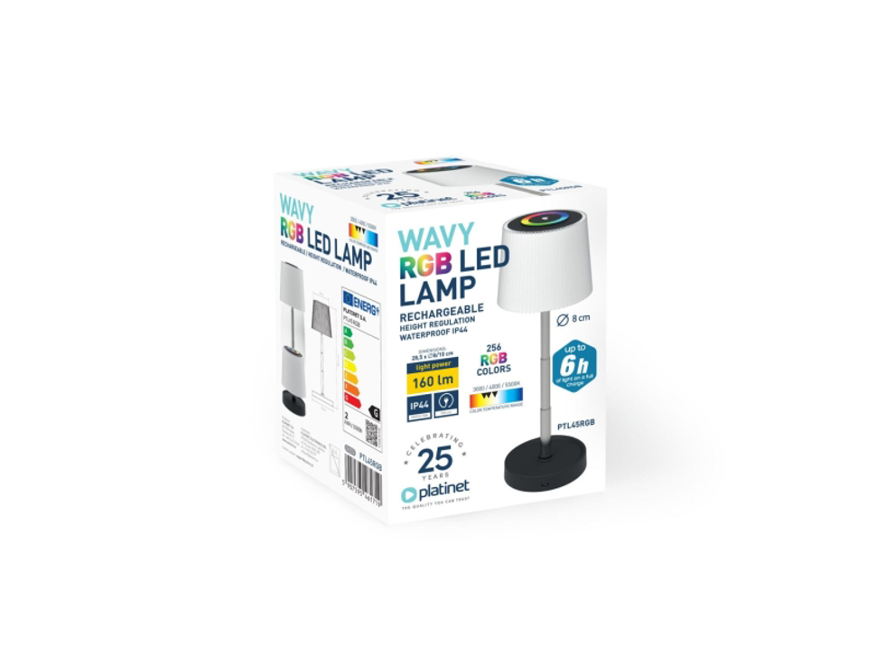 Kompaktní a stylová RGB LED lampa PTL45RGB zaujme nejen svým moderním vzhledem, ale i praktickými funkcemi. Díky možnosti nastavení výšky a volby barevného světla si snadno přizpůsobíte osvětlení přesně podle svých potřeb – ať už ji využijete jako stolní lampu při práci, nebo jako jemné noční světlo pro vytvoření příjemné atmosféry. Lampa je vybavena 12 LED diodami s výkonem 1,4W, které poskytují světelný tok až 160 lumenů. Nabízí tři odstíny bílého světla (3000 K – teplá bílá, 4000 K – neutrální bílá, 5500 K – studená bílá) a navíc RGB režim pro barevné osvětlení. Index podání barev Ra > 80 zajišťuje přirozené zobrazení barev. Ovládání je řešeno jednoduchým stiskem vypínače, kterým lampu zapnete, vypnete nebo přepnete mezi jednotlivými režimy. Díky plynule nastavitelné výšce si můžete lampu přizpůsobit tak, aby vyhovovala konkrétní situaci. Lampa má základnu o průměru 10 cm a je možné ji vysunout až do výšky 28,5 cm. Vestavěná baterie s kapacitou 1200 mAh umožňuje bezdrátové používání, takže lampu můžete snadno přenášet a používat i tam, kde není k dispozici zásuvka. Baterie vydrží až 6 hodin. Nabíjení je řešeno pomocí 1m USB kabelu, který je součástí balení. Konstrukce z ABS plastu, PS a oceli zajišťuje odolnost a dlouhou životnost. Díky hmotnosti pouhých 250 g je lampa lehká a snadno přenosná. Tato RGB LED lampa je ideálním řešením pro každý interiér – kombinuje funkčnost, variabilitu a moderní design. Lampa je vybavena vestavěnou LED technologií - není potřeba dokupovat žárovku. Možnosti barevného osvětlení pomocí RGB režimu. Možnost nastavení intenzity světla (stmívání). Lze používat i bez připojení k zásuvce - ideální na cesty nebo při výpadku proudu.