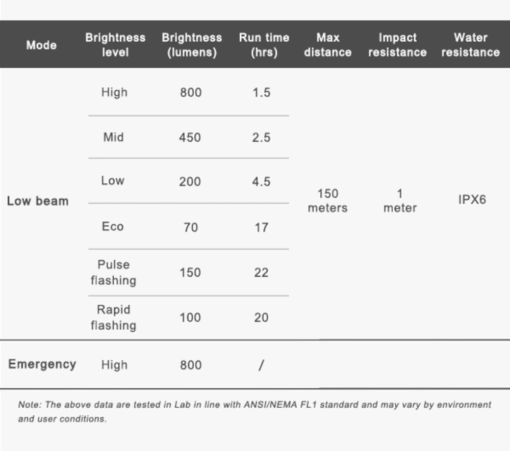 | CR450 | 450 lm | 1600 mAh Li-ion | 87 g | 82 × 29 × 32 | Krátké městské jízdy, cyklostezky |