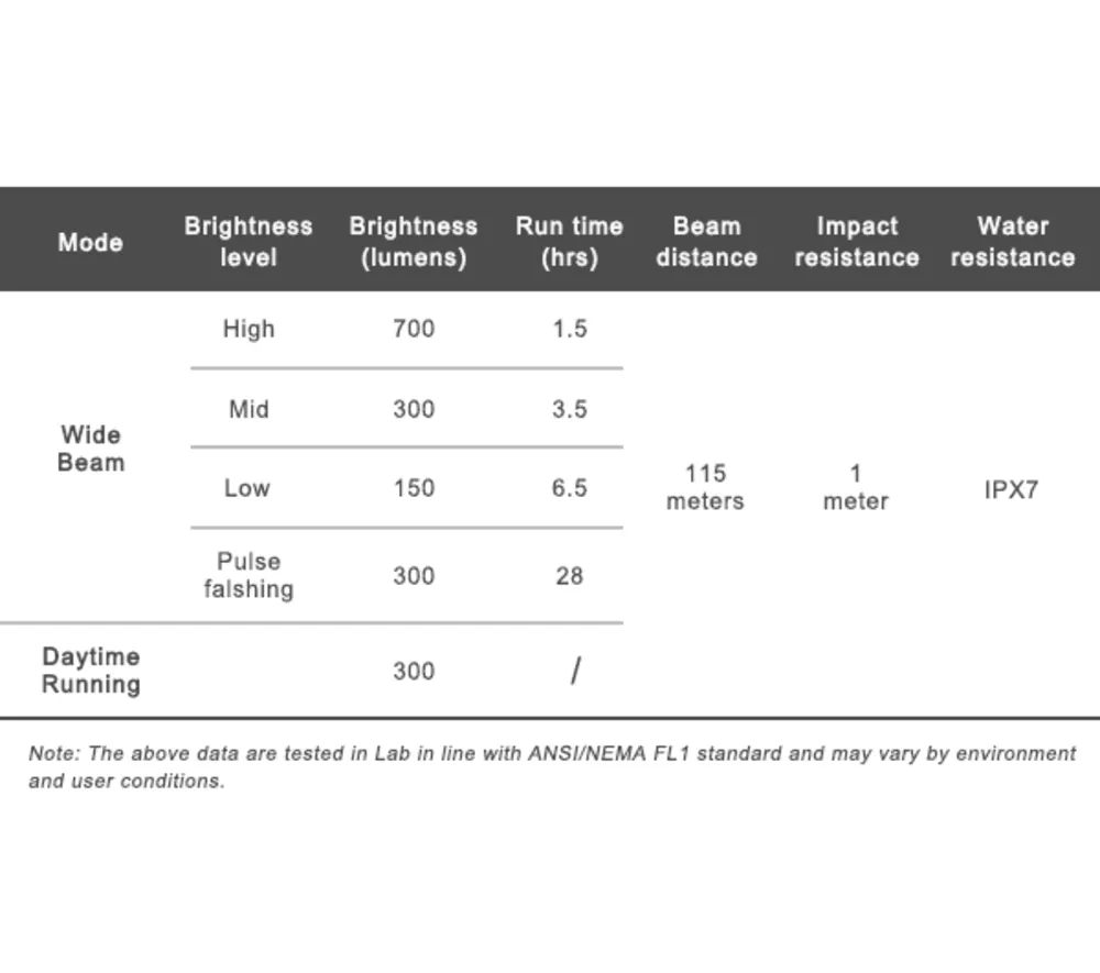 Světlo si pamatuje poslední nastavenou úroveň jasu, šetří baterii v krizových momentech a chrání se proti přehřátí. Tělo z eloxovaného hliníku je voděodolné dle normy IPX7 a díky rychloupínacímu systému je nasazení i sundání otázkou vteřin. Nabíjení probíhá přes USB-C konektor.