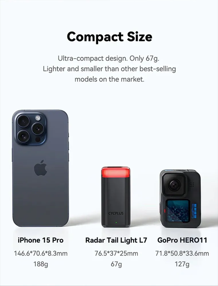 Cyklistický radar CYCPLUS L7 je nezbytným doplňkem pro každého cyklistu, který klade důraz na bezpečnost. Díky svým inovativním funkcím a vysoké kvalitě výroby Vám poskytne klid a pohodlí při každé jízdě.