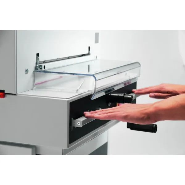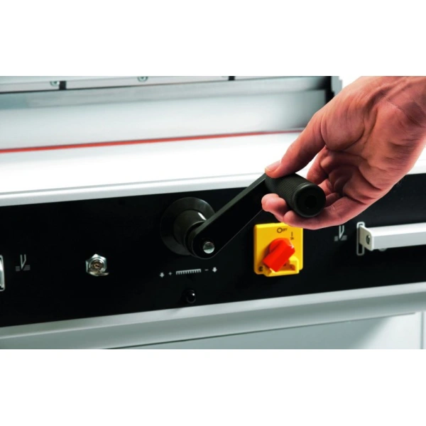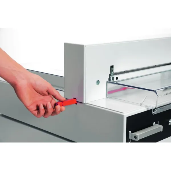 - Bezpečnostní funkce: Řezačka je vybavena řadou bezpečnostních funkcí, které chrání uživatele před úrazem. Patří mezi ně spuštění řezu oběma rukama, elektronicky jištěný transparentní bezpečnostní kryt na předním stole,automatický zpětný chod nože a hlavní vypínač s bezpečnostním zámkem.