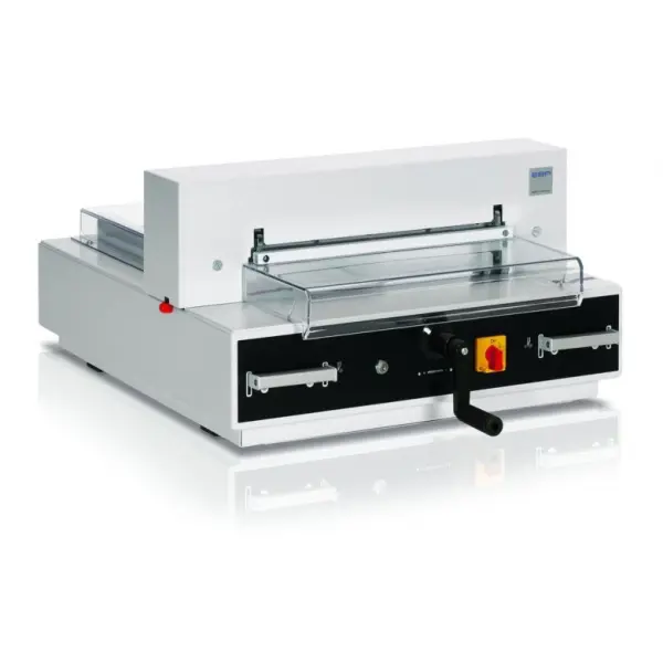 - Vysoký výkon: Řezačka EBA 4350 je poháněna elektromechanickým motorem, který zajišťuje plynulý a výkonný řez. Dokáže bez námahy řezat stohy papíru o tloušťce až 40 mm a délce řezu až 430 mm.