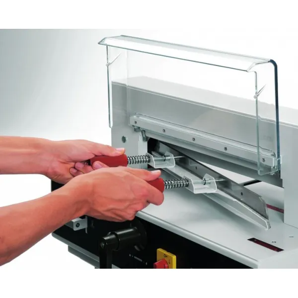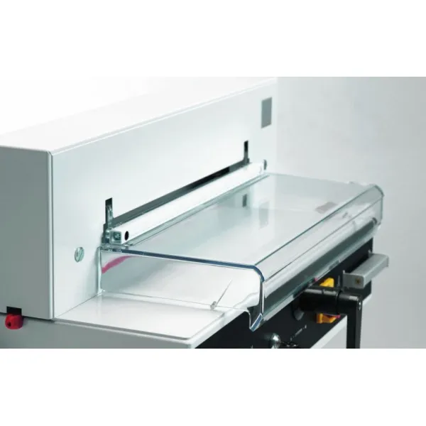- Bezpečnost: Řezačka EBA 4350 je navržena s ohledem na maximální bezpečnost. Je vybavena sklopným plexi krytem, elektronicky jištěným bezpečnostním krytem a automatickým zpětným chodem nože a lisu.