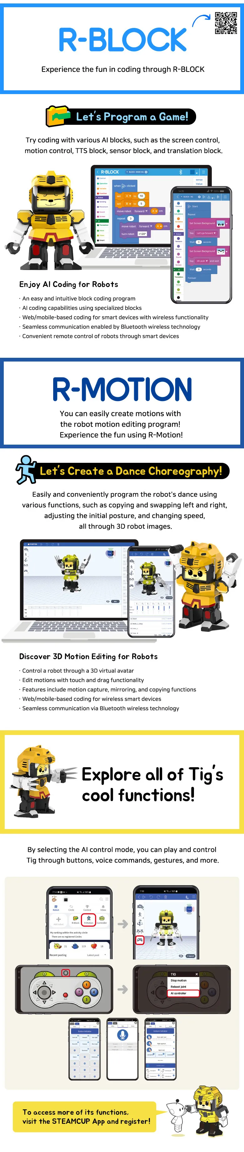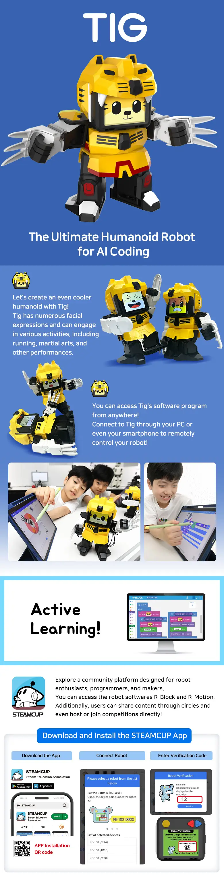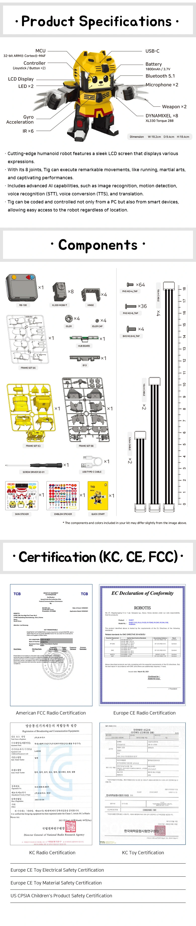 Tig je humanoidní robot s širokou škálou funkcí a vlastností, které z něj dělají všestranného pomocníka a zábavného společníka pro celou rodinu. Díky pokročilé umělé inteligenci a odolné konstrukci je Tig ideální jak pro zábavu, tak pro vzdělávání a praktické úkoly.