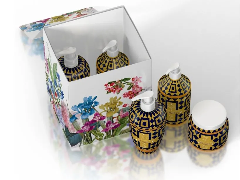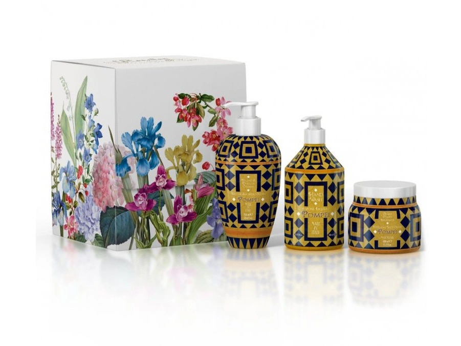 Krásná dárková sada v nádherné krabičce a se skvělým designem a produkty s vůní POMPEI. Sada obsahuje sprchový gel/pěnu do koupele 700 ml, luxusní jemné tekuté mýdlo na ruce 500 ml a hydratační tělový krém 450 ml.