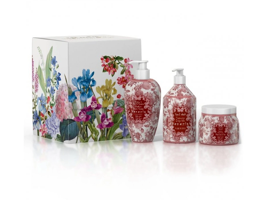 Krásná dárková sada v nádherné krabičce a se skvělým designem a produkty s vůní VENEZIA. Sada obsahuje sprchový gel/pěnu do koupele 700 ml, luxusní jemné tekuté mýdlo na ruce 500 ml a hydratační tělový krém 450 ml.