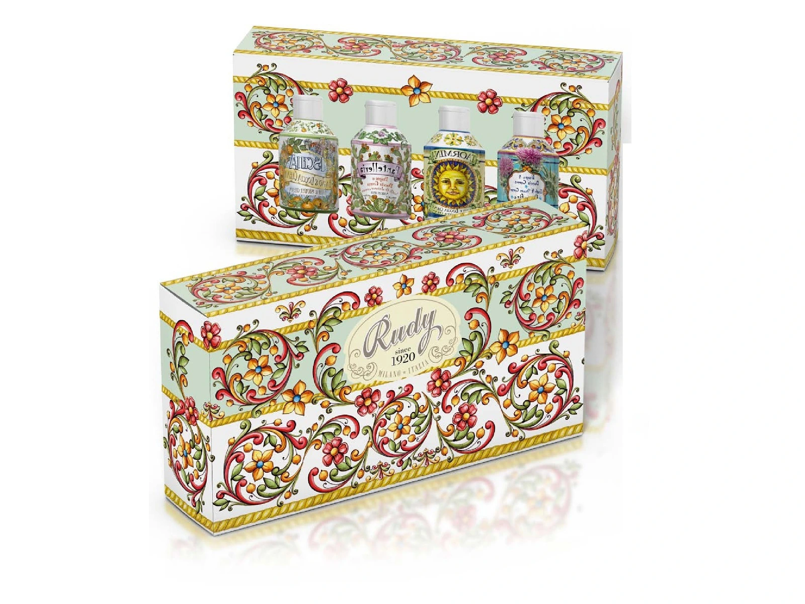 Rudy Profumi představuje svojí unikátní kolekcí MAJOLICHE řadu produktů určených jak pro člověka a jeho osobní péči, tak jako bytový doplněk v elegantním klasickém stylu. Tato jedinečná řada odkazuje na tradici MAJOLIK, které coby luxusní dekorativní prvek nechyběly v bohatých domácnostech počínaje starověkem. Zároveň kolekce MAIOLICHE vzdává hold italské kreativitě a proto produkty odkazují na světoznámá italská místa a města.