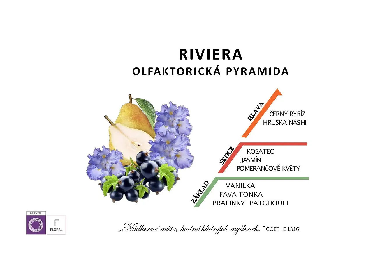 RIVIERA je ovocná, květinová a vanilková vůně. K dispozici je samozřejmě i náhradní Náplň pro mýdlo, která vystačí na 2 kompletní doplnění vašeho originálního flakonu.