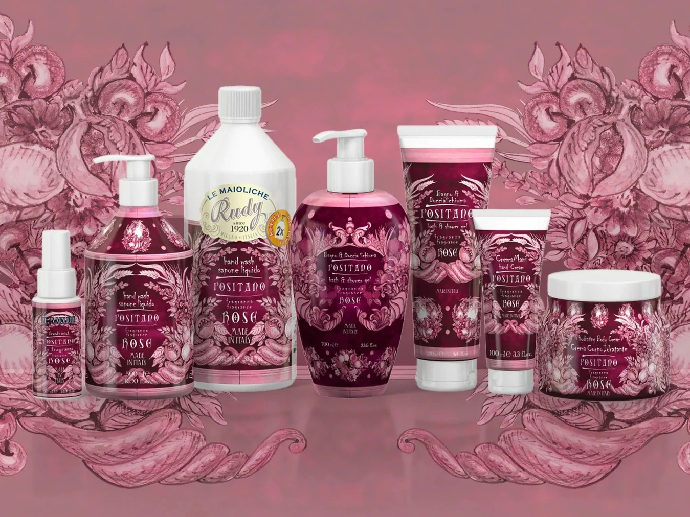 Rudy Profumi představuje svojí unikátní kolekcí MAJOLICHE řadu produktů určených jak pro člověka a jeho osobní péči, tak jako bytový doplněk v elegantním klasickém stylu. Tato jedinečná řada odkazuje na tradici MAJOLIK, které coby luxusní dekorativní prvek nechyběly v bohatých domácnostech počínaje starověkem. Zároveň kolekce MAIOLICHE vzdává hold italské kreativitě a proto produkty odkazují na světoznámá italská místa a města.