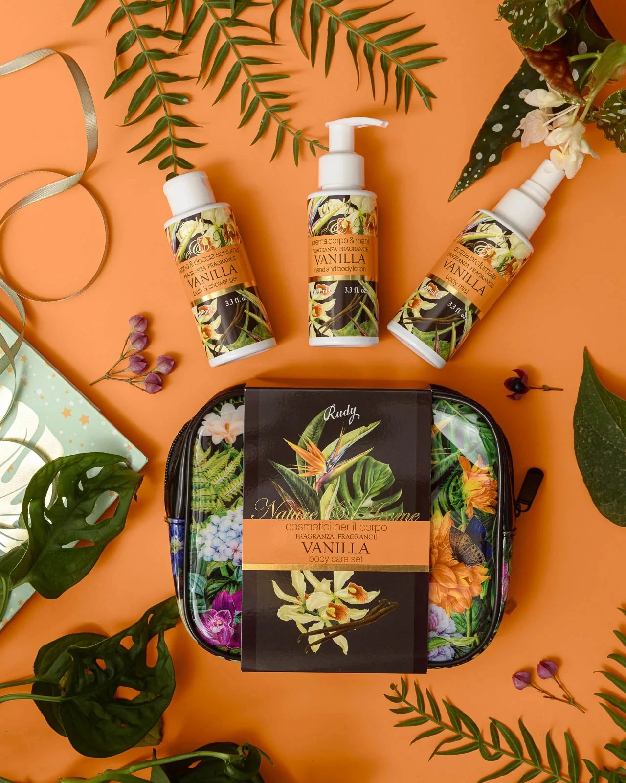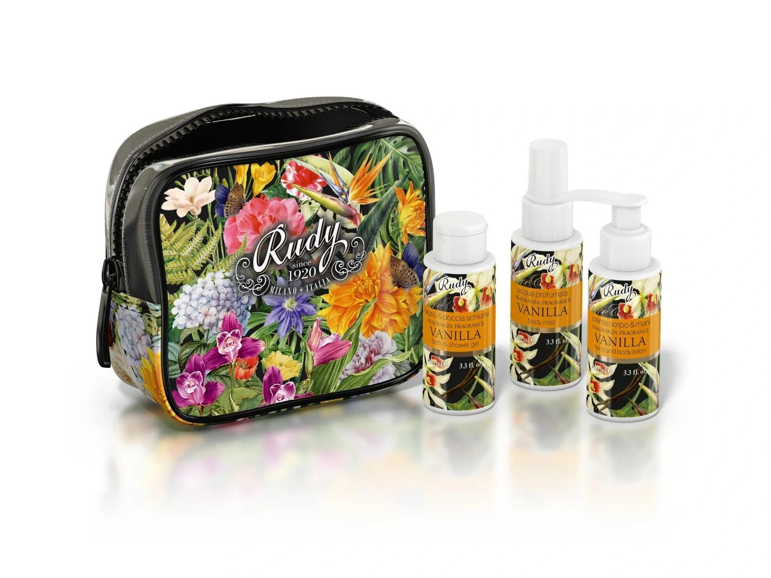 Užitečný dárek v podobě elegantní tašky se vším, co je potřeba na cesty abyste se v každé chvíli cítila čistá a svěží. V tašce najdete v praktických 100 ml lahvičkách sprchový gel, tělový krém a parfémovaný sprej na tělo. To vše s překrásnou orientální vůní VANILLA.