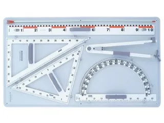 Sada tabulového nářadí obsahující pravítko 100 cm s decimetrovým dělením, rovnoramenný trojůhelník 60cm, nerovnoramenný trojůhelník 60cm, kružidlo, úhloměr a ukazovátko. Všechny pomůcky jsou vyrobeny z odolného bílého plastu. Sada je umístěna na pevné desce o rozměrech 100 x 63cm určené pro montáž na zeď. Vhodné pro všechny typy tabulí.
