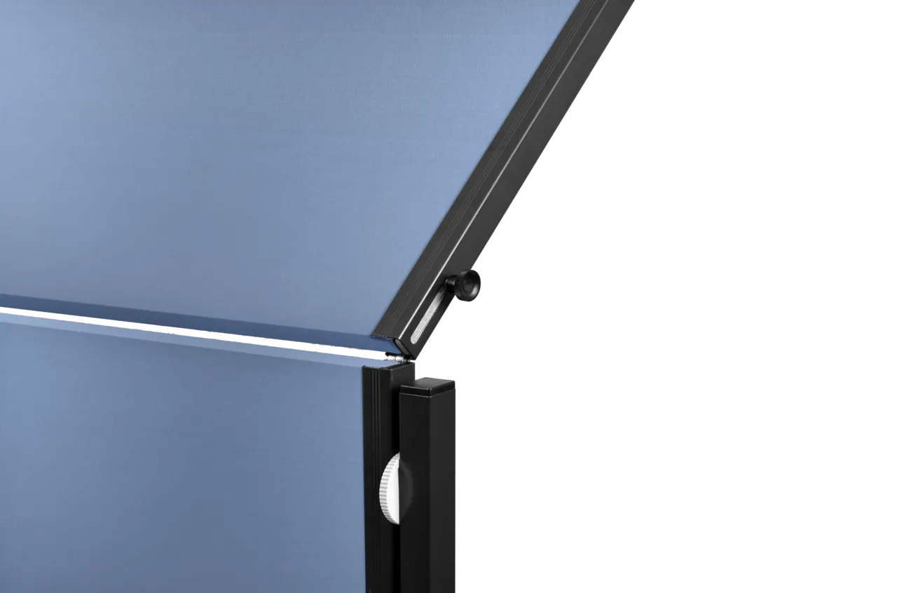 Oboustranná skládací tabule PREMIUM PLUS se světle modrým textilní povrchem. Jednoduchý stabilní design, lehká tabule, matně černý hliníkový rám. Mobilitu zajišťují 4 kolečka, z nichž je každé opatřeno brzdou pro větší stabilitu tabule. Složení je velice snadné a rychlé. Stojan je speciálně navržen tak, aby tabule mohly stát těsně u sebe i v případě natočení do různých úhlů. Velikost vlastní tabule je 150x120 cm, výška horní hrany je 196 cm v případě sestavení s tabulí na šířku nebo 226 cm v případě sestavení s tabulí na výšku. Hmotnosttabule včetně ránu je 9,5 kg.