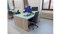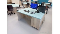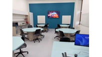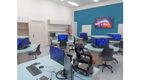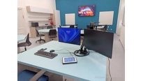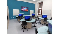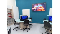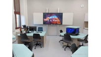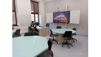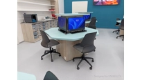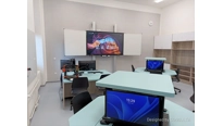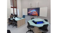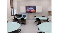 V učebně jsme navrhli a dodali zcela nový moderní nábytek včetně speciálních počítačových stolů, které mají výsuvný střed. Každý stůl má uvntř 4 počítače a LCD displeje. Stoly se ovládají dohromady, zvlášť levá nebo pravá polovina a samozřejmě také jednotlivě. Tento způsob ovládání zajistí maximální flexibiltu a možnost využívání učebny různým způsobem v kontextu požadavku výuky. V čele učebny je velký 86 palcový dotykový LCD displej s křídly, umístěný na pylonovém zvedacím systému s velkým rozsahem pojezdu. Druhý displej je umístěný na protilehlé stěně a umožní jak zrcadlení obrazu z hlavního displeje tak možnost zobrazit vlastní obsah. To je velmi žádané při práci ve skupinách nebo při různých testech apod. Ovládání stolů a distribuce signálů do obou displejů zajišťuje náš kontrolní sytém s dotykovým displejem díky kterému je ovládání učebny hračkou a zvládne ho každý.