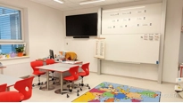 V zadní části učebny jsou další velkoplošné bezrámové tabule, které se využívají při práci ve skupinách, aby bylo více prostoru na psaní a nápady. Akustiku v místnosti zlepšují akustické panely pod policemi, které slouží současně jako nástěnky.