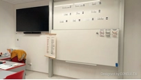 Protože se jedná primárně o jazykovou učebnu tak je tu velká plocha pro psaní, kterou zajišťují dvě dvou a půl metrové tabule na pylonových zvedacích systémech a velkoplošný displej s rozlišením 4K, který slouží pro prezentace, videa pokusů atd.