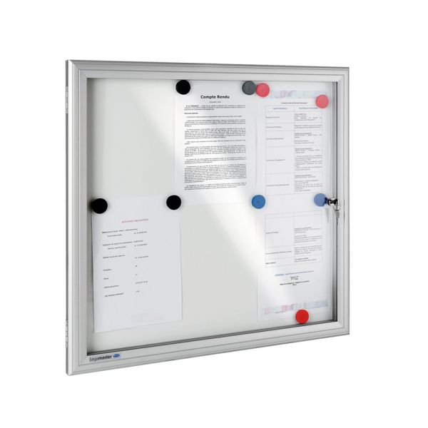 Uvnitř vitríny je bílá magnetická popisovatelná tabule. Informace tak můžete pohodlně psát přímo na bílý povrch běžným popisovačem na bílé tabule nebo můžete dokumenty připnout pomocí magnetů.
