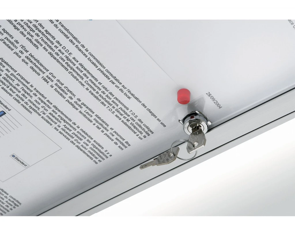O snadnou manipulaci a jednoduchou výměnu prezentovaného obsahu se postarají otevírací dvířka s panty, které lze otevírat na levou stranu. Dvířka jsou uzamykatelná a zabráníte tak zneužití, odcizení nebo poškození prezentovaného materiálu.